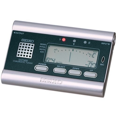 The Seiko SAT500 is a portable high-accuracy digital chromatic tuner with sound reference. It features a highly visible LCD needle display with LED guide lights, along with input & output jacks, digital cent indication, key transpose function, a wide tuning range (A0 - C8), 12 pitch reference notes, auto and manual modes, auto power-off after 20 minutes, octave indication, memory backup, and included batteries. With so much versatility in such a small package, you can't go wrong with this chromatic tuner from Seiko.